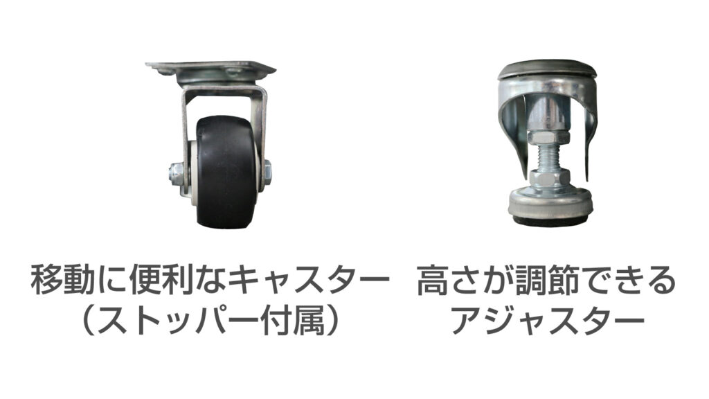 移動に便利なキャスター(ストッパー付属)、高さ調整ができるアジャスター付き。