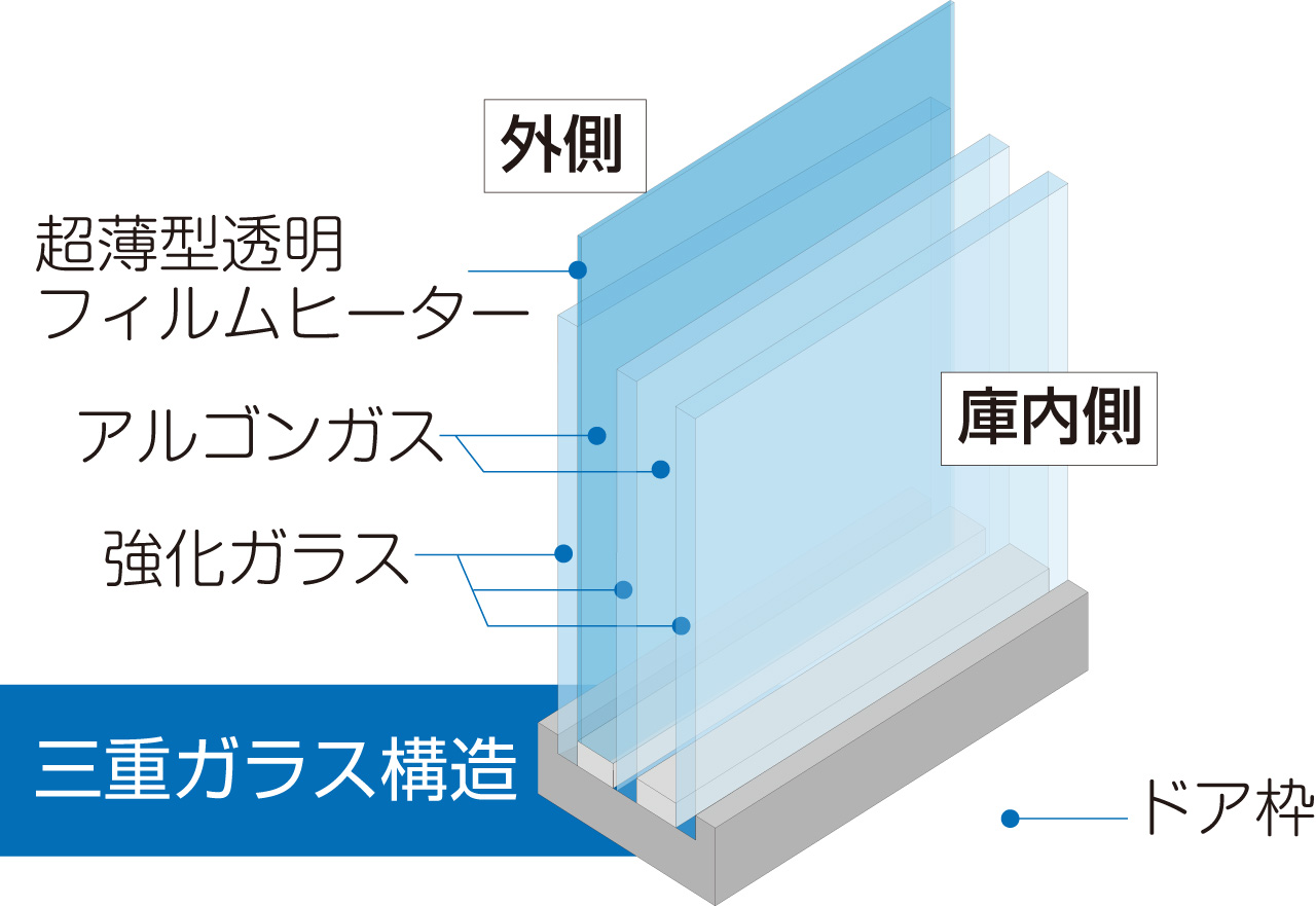 ドアガラス内側に設置した、超薄型フィルムヒーターでガラスを加熱し結露を防ぎます。