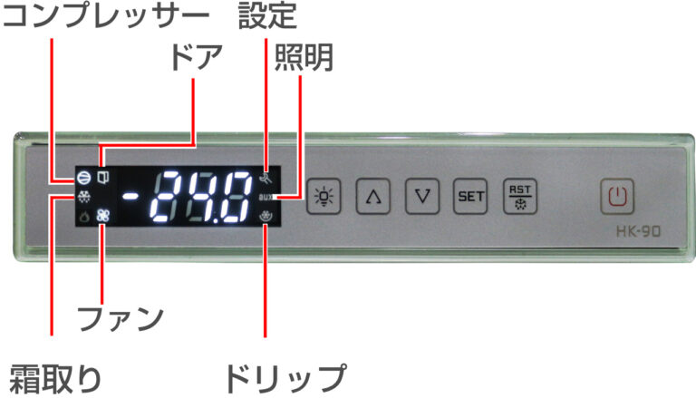 コントロールパネルはデジタル表示を採用。一目で庫内の温度が分かります。ディスプレイの「コンプレッサー」「霜取り」「照明」「ファン」「ドリップ」の表示は作動時に、「ドア」は開いている時に店頭して、現在の状態をお知らせします。
