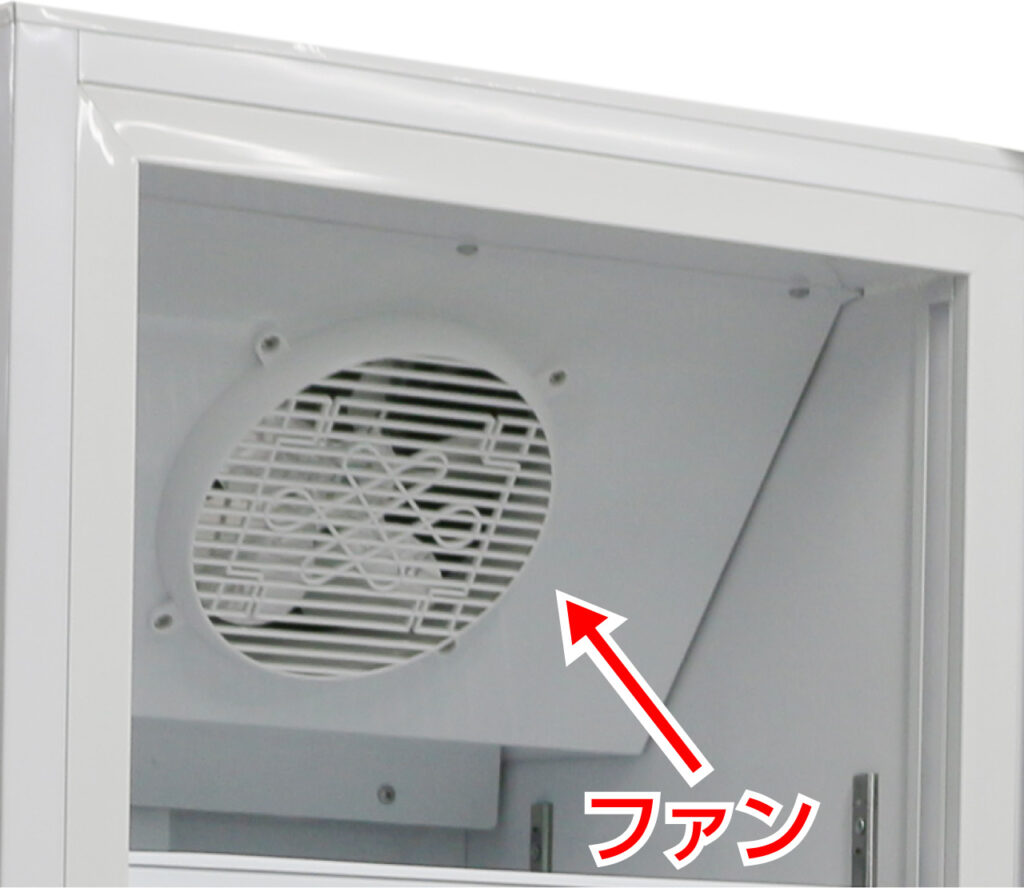 庫内で温度が上がった空気はファンの力により正面から吸い上げられます。常に適切な温度の冷気を循環させることで効率よく庫内を冷やします。